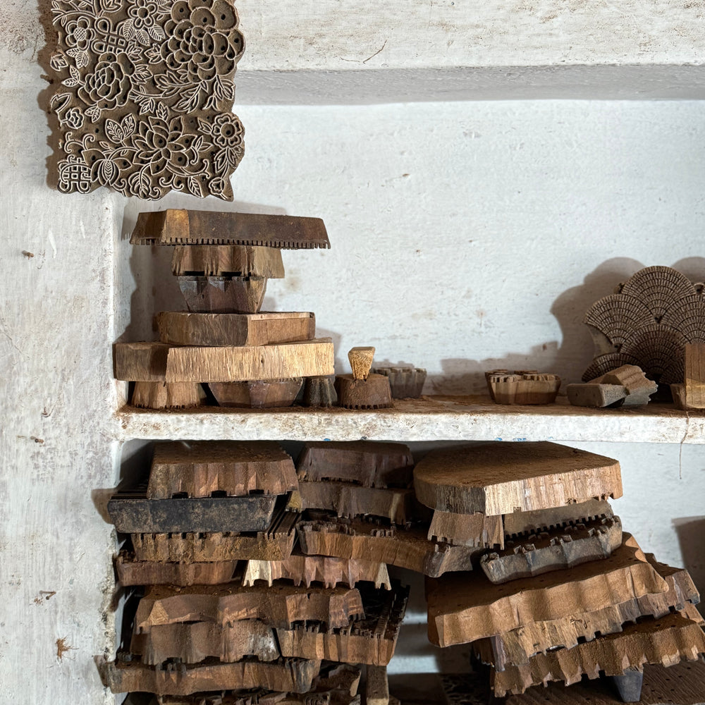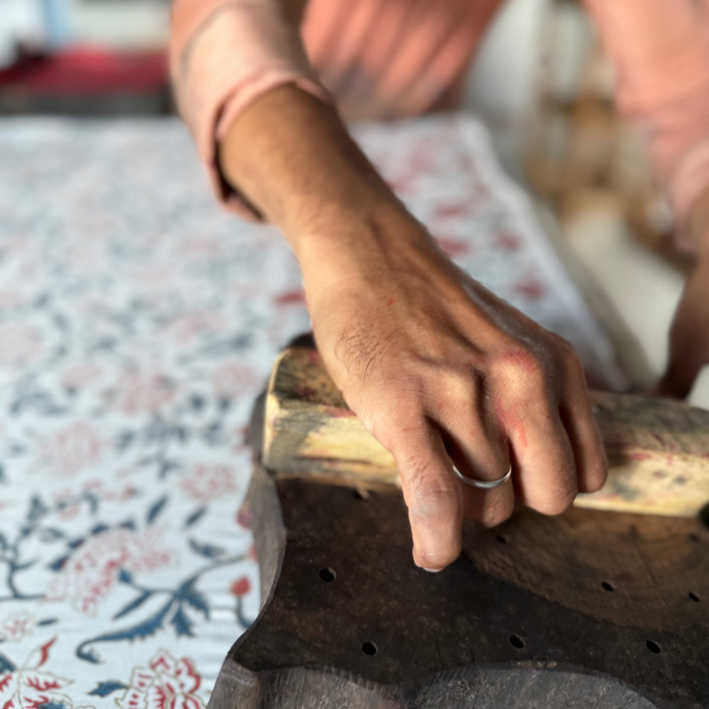 Every collection begins with a technique, not a trend. Our pieces are shaped by time‑honoured methods: Kantha running stitches from Bengal that ripple through layered cloth; Sanganeri block prints from Rajasthan pressed by hand with carved wooden blocks, often in delicate florals and lattices; Ajrakh’s patient, many‑stage resist printing with its calm geometry; and Kashmiri crewel, a dense chain‑stitch that builds pattern in relief. We work in small batches with skilled artisans who keep these traditions alive, so the slight variations you see are the maker’s mark - not a flaw